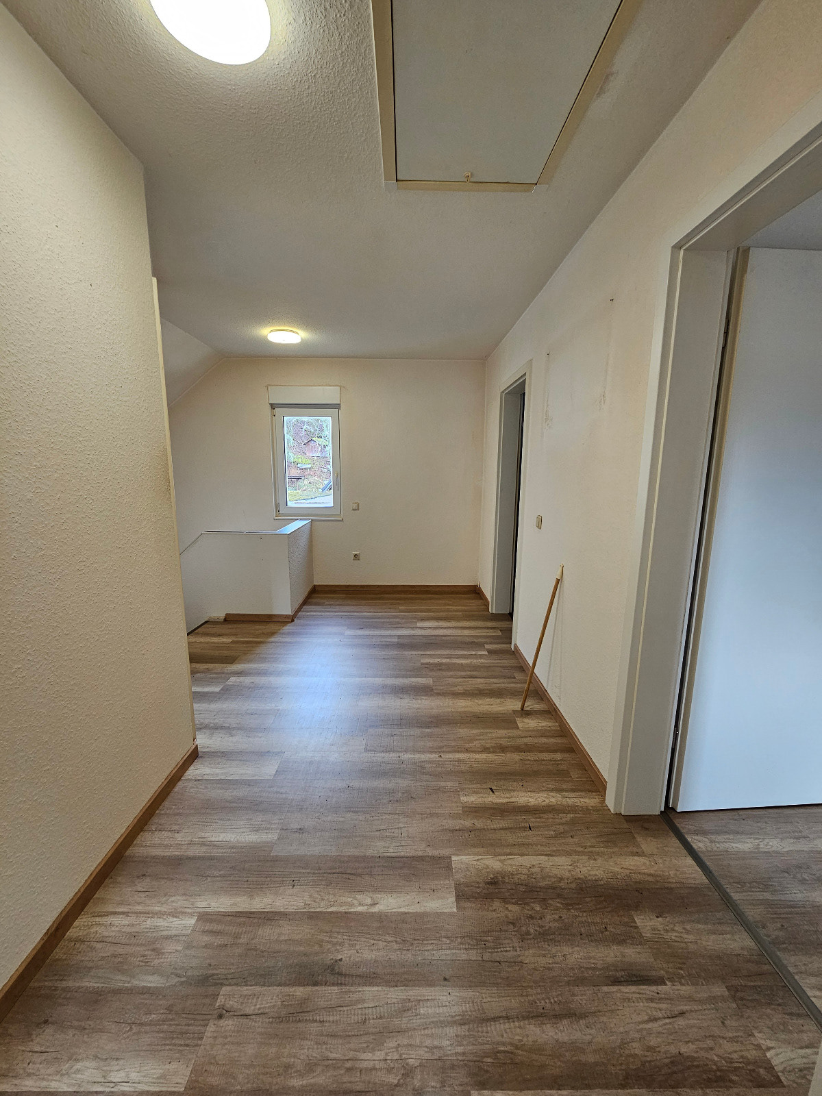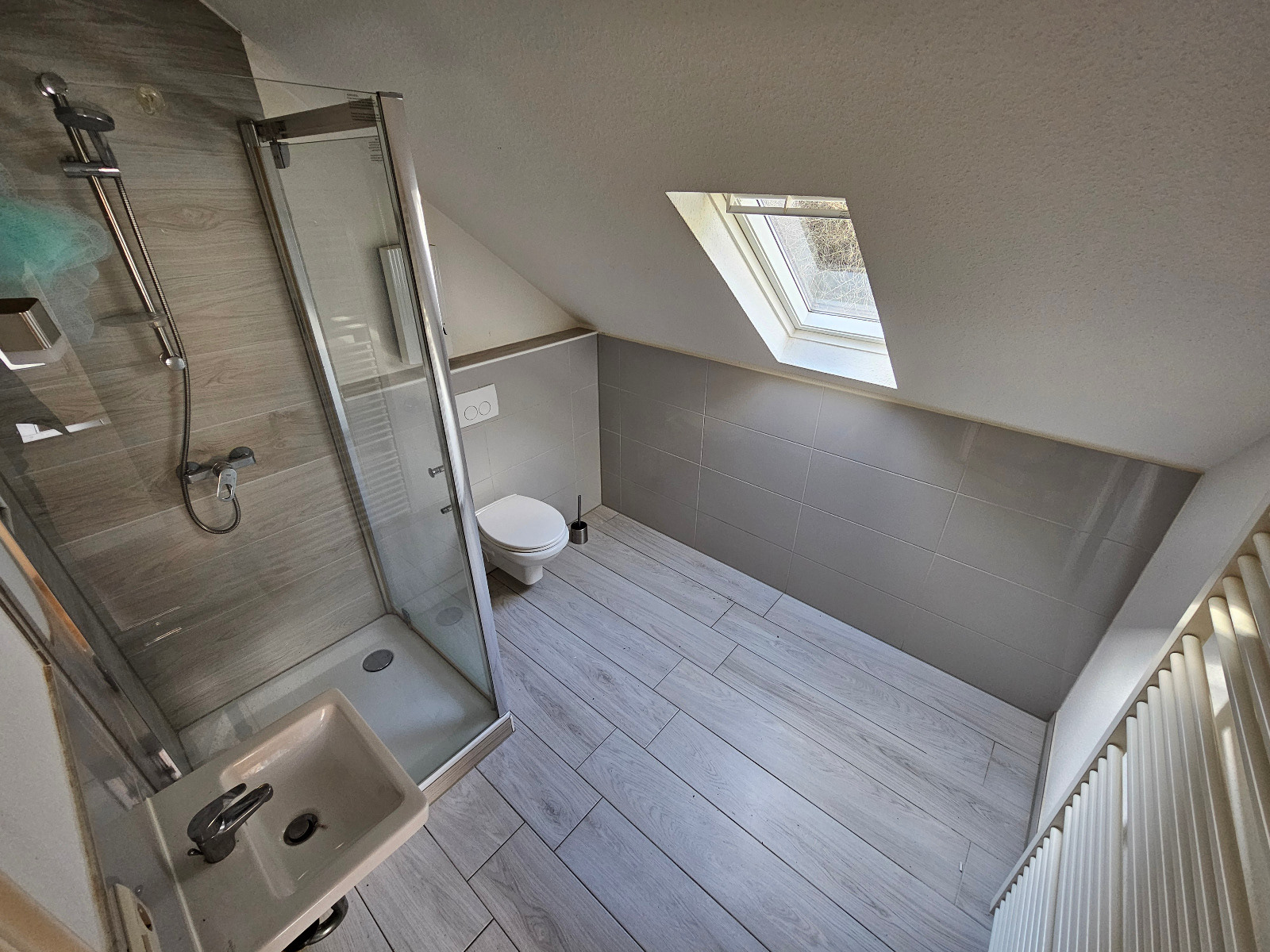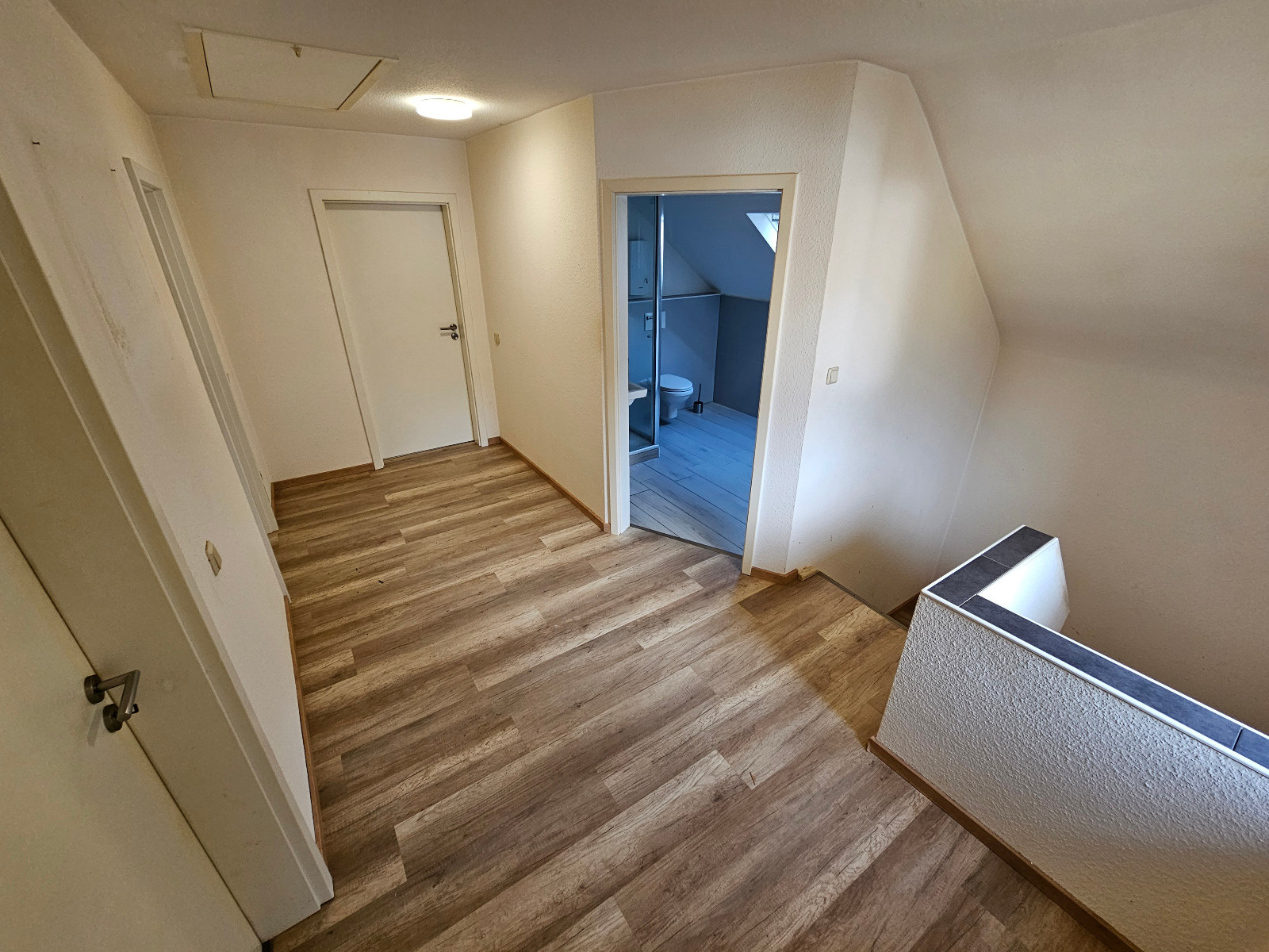 Das Obergeschoss umfasst drei Zimmer, einen Flur sowie ein weiteres Badezimmer mit Dusche und Dachfenster. Der Dachboden ist über eine ausziehbare Treppe erreichbar und bietet zusätzliche Nutz- und Abstellfläche.