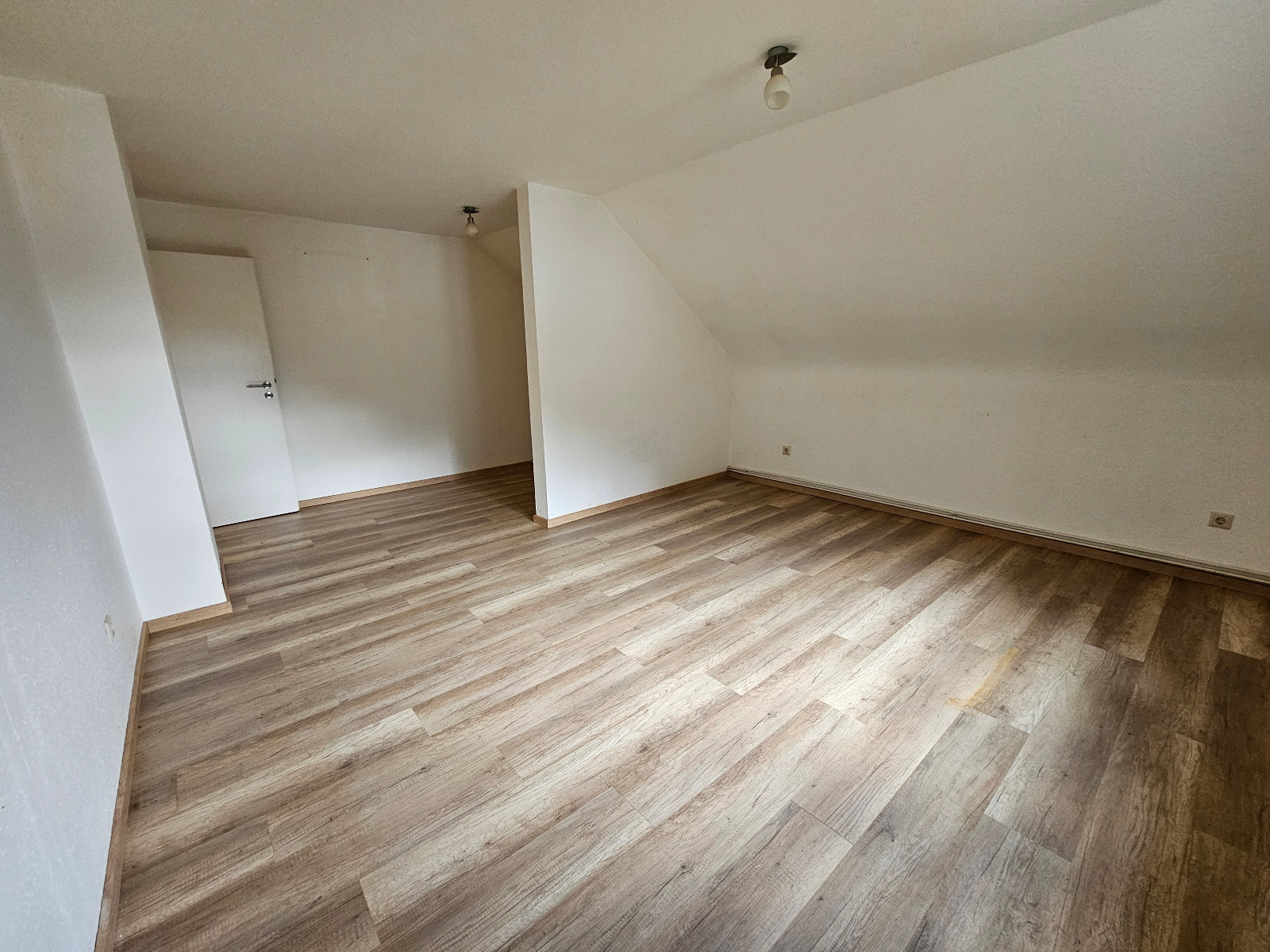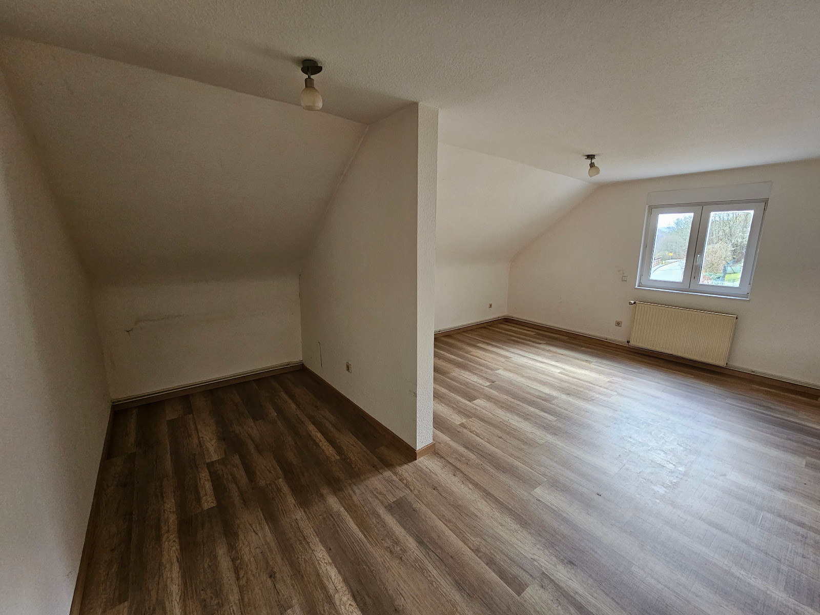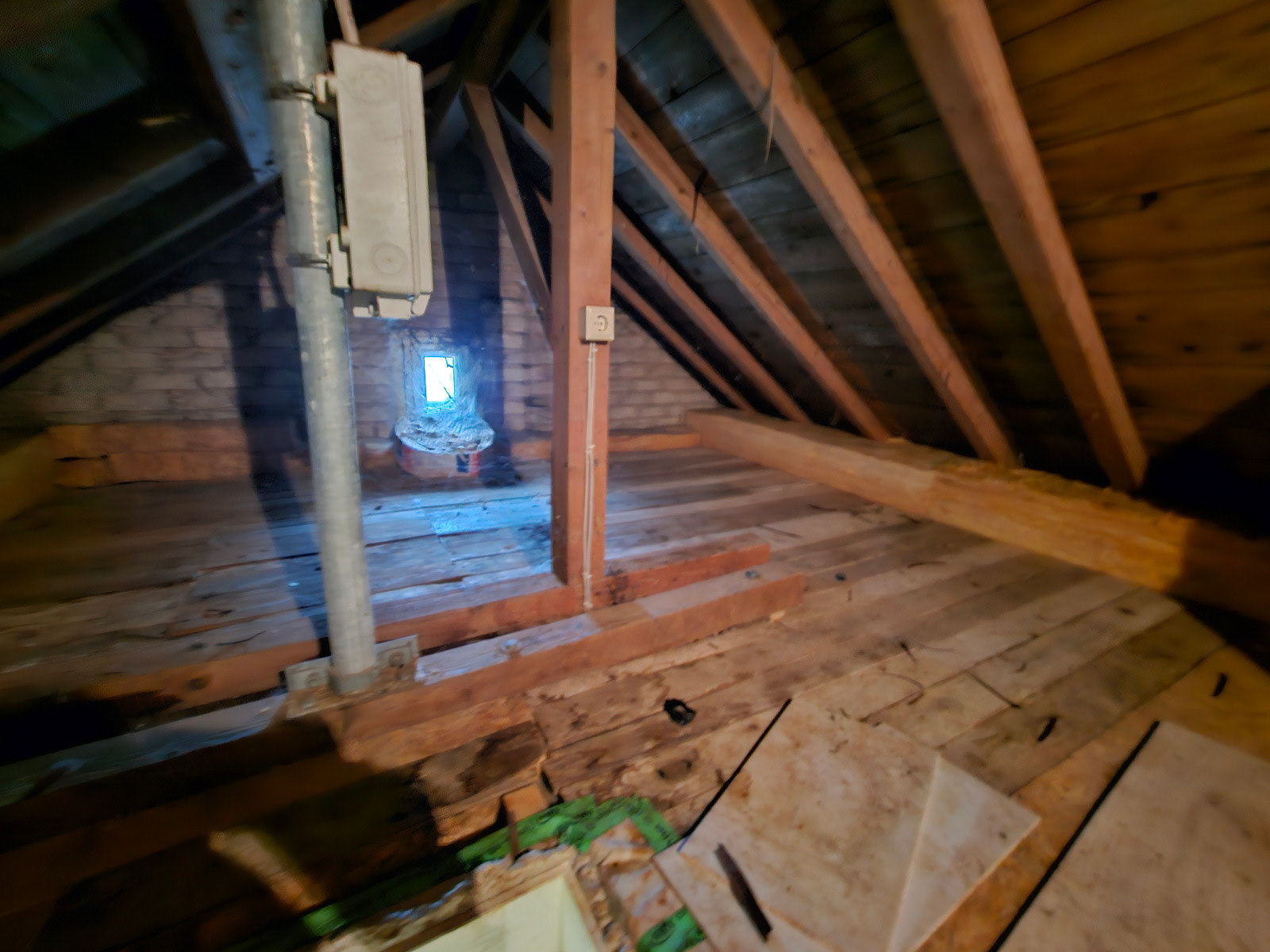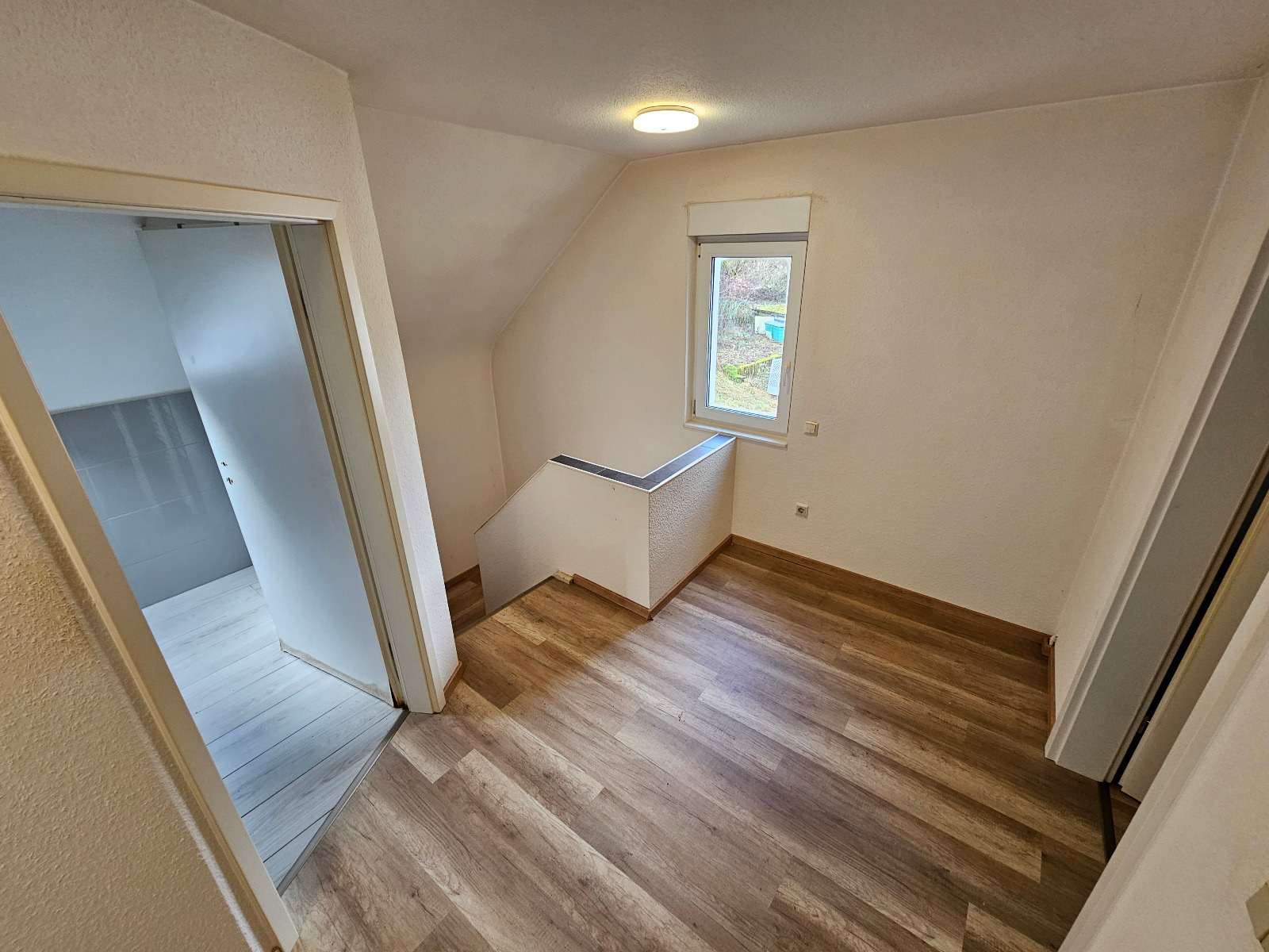 Das Obergeschoss umfasst drei Zimmer, einen Flur sowie ein weiteres Badezimmer mit Dusche und Dachfenster. Der Dachboden ist über eine ausziehbare Treppe erreichbar und bietet zusätzliche Nutz- und Abstellfläche.