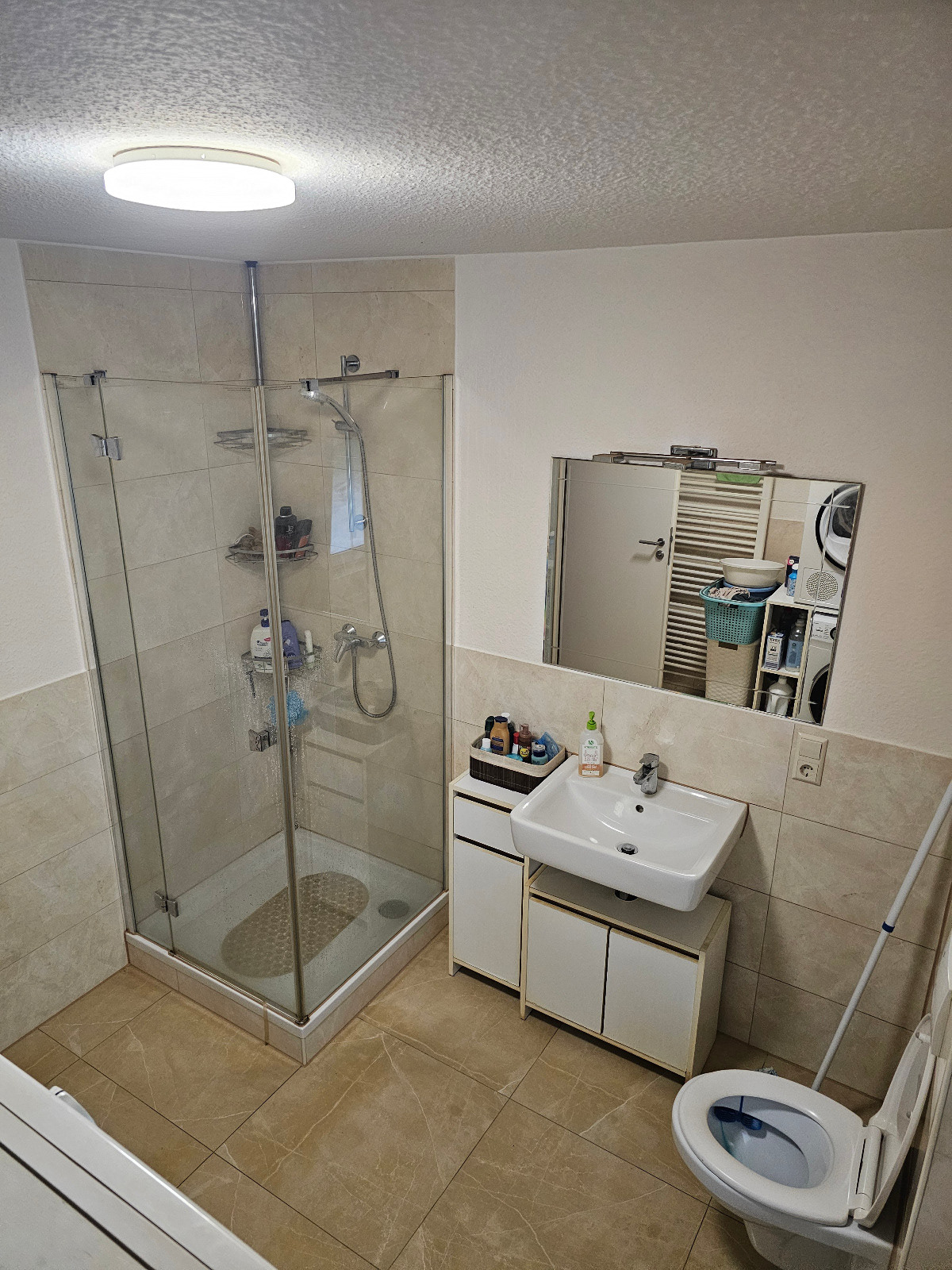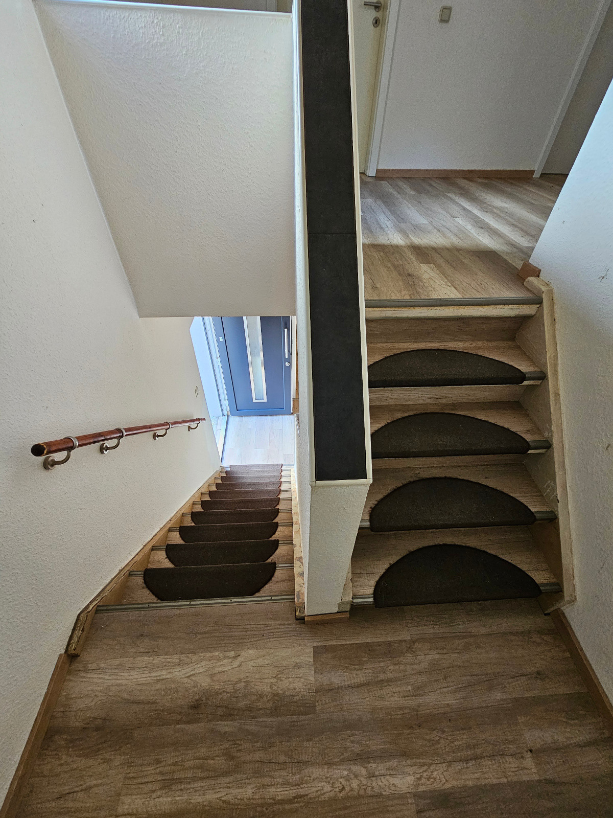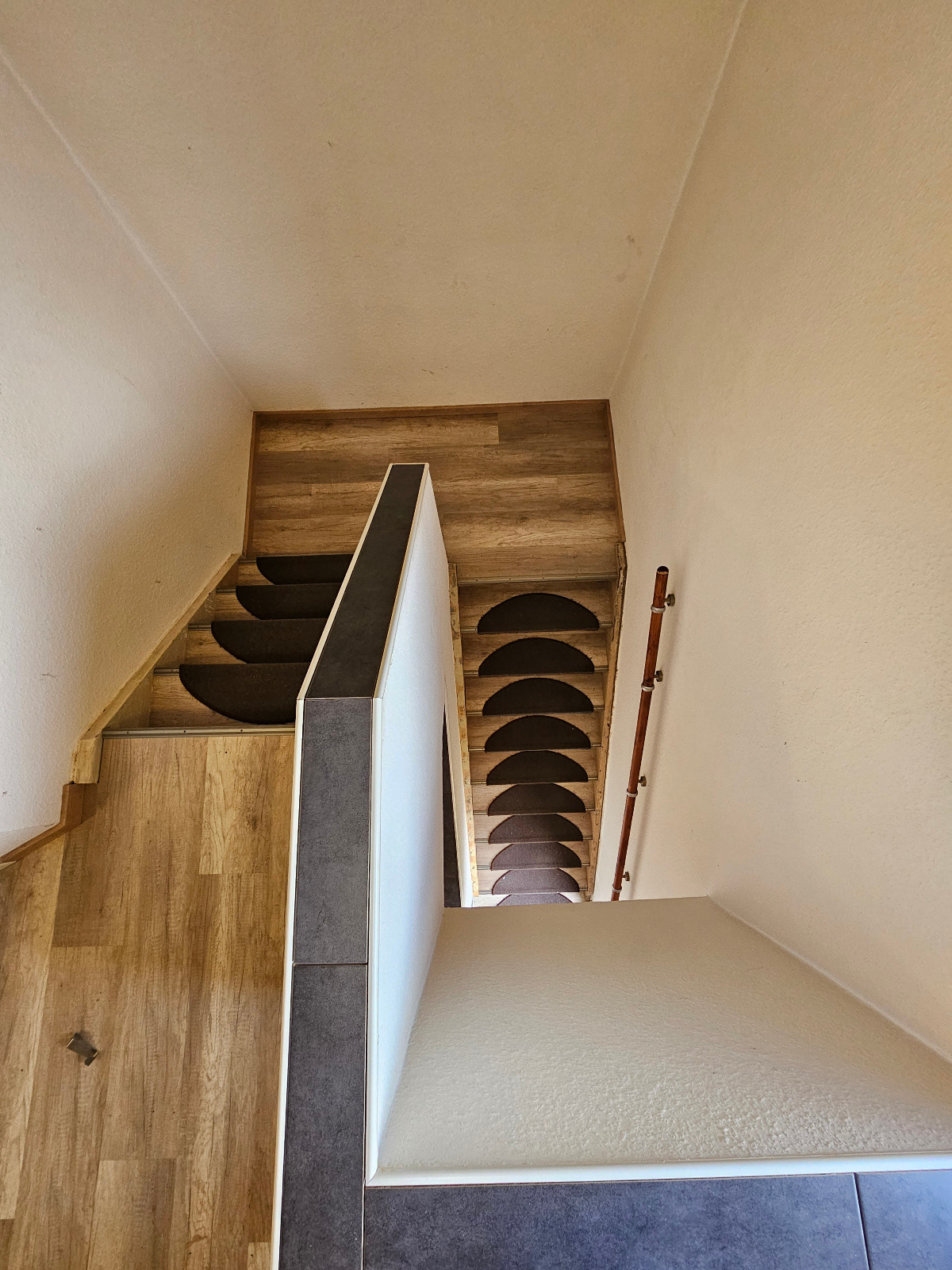 Im Erdgeschoss befinden sich ein großzügiges Wohnzimmer mit Möglichkeit zur Integration einer offenen Küchenlösung, ein modernisiertes Badezimmer mit Dusche und WC, ein Abstellraum sowie ein weiterer flexibel nutzbarer Raum (z. B. Büro oder Gästezimmer). Ein zentraler Flur verbindet die Räume auf dieser Ebene.