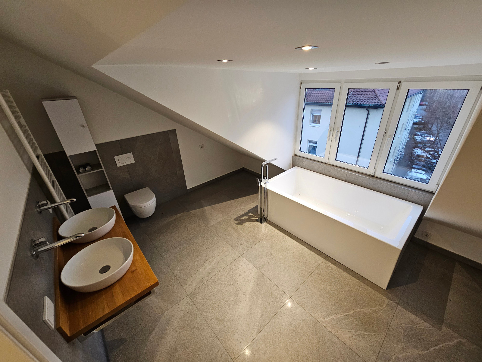 Großzügiges Tageslichtbad mit Badewanne, Dusche und Doppelwaschtisch