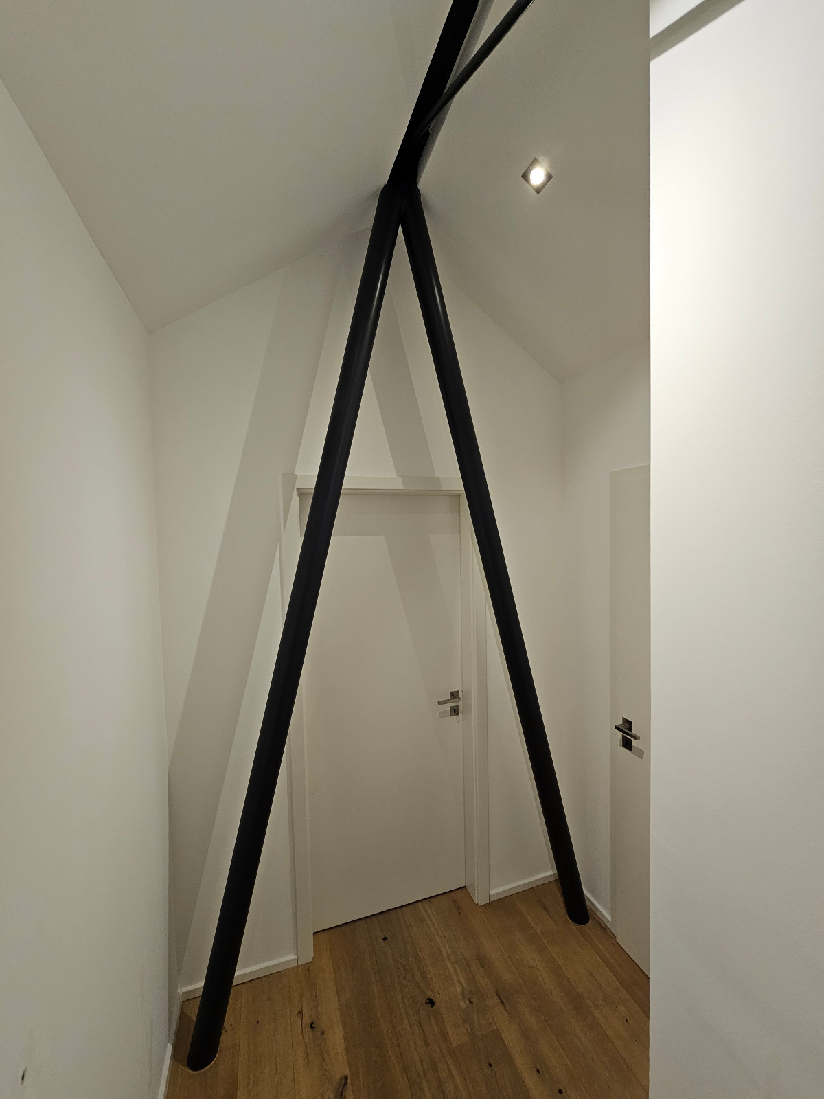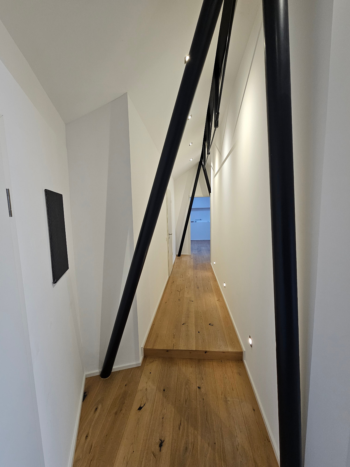 Markante schwarze Stahlträger setzen bewusste architektonische Akzente und verleihen der Wohnung ihren unverwechselbaren Loft-Charakter. Die reduzierte, klare Formsprache erinnert an die skandinavische Architekturszene – angelehnt an die Designsprache von Reiulf Ramstad.
