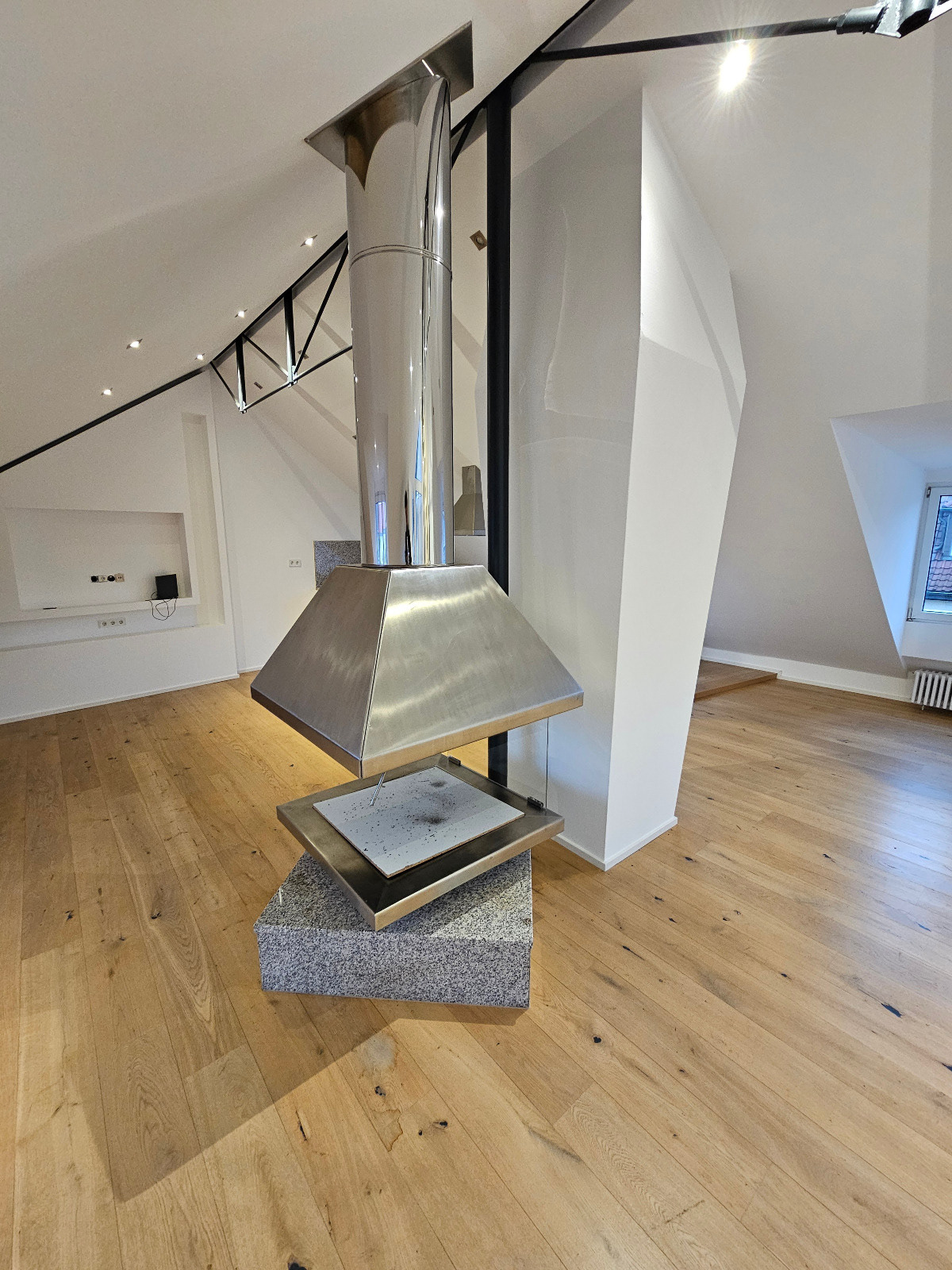 Bereits beim Betreten eröffnet sich ein beeindruckendes Raumgefühl: Großzügigkeit, Licht und klare Linien bestimmen das Ambiente. Der offen gestaltete Wohn- und Essbereich bildet das Zentrum der Wohnung. Hier steht der freistehende, offene Kamin wie eine Skulptur im Raum – kraftvoll, modern und zugleich atmosphärisch. Er schafft ein Wohngefühl, das man sonst nur aus hochwertigen Architekturmagazinen kennt.