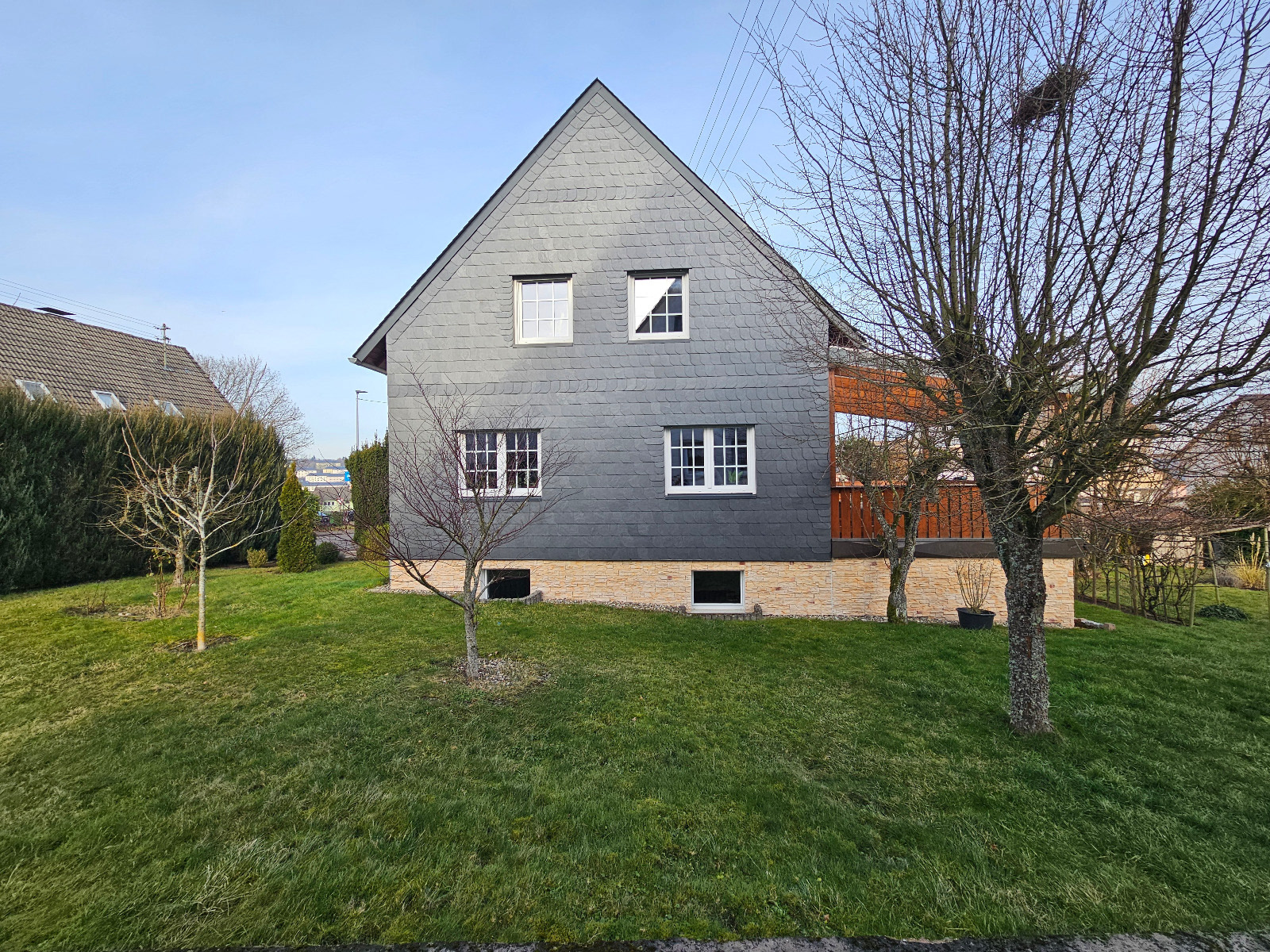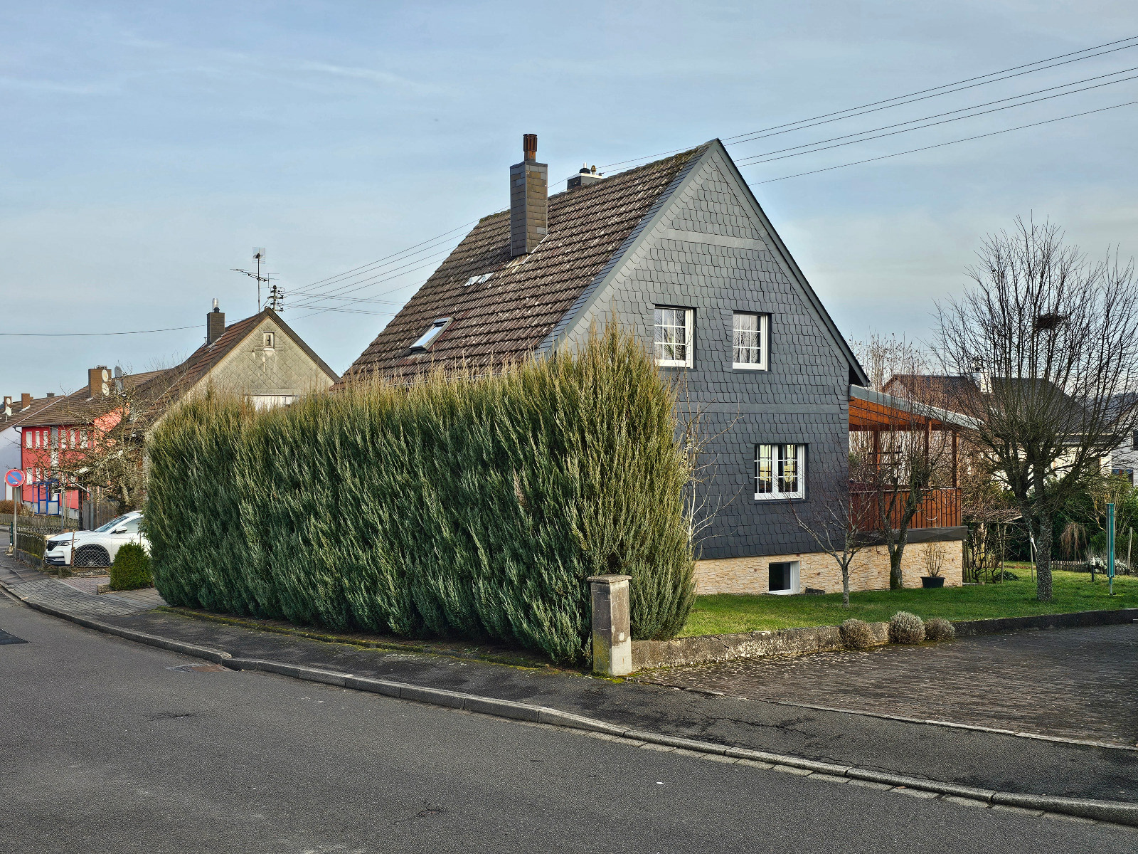 Eine Gebäudeseite mit Schieferfassade