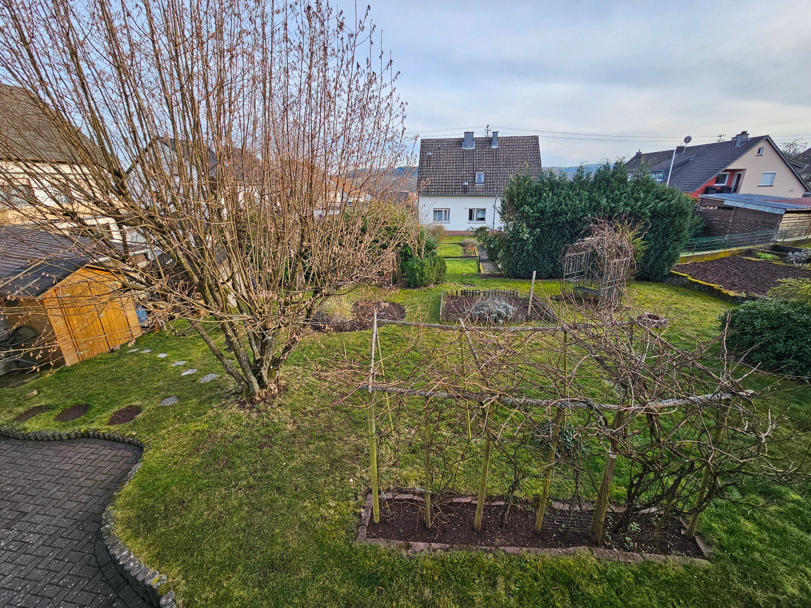 Der Außenbereich ist gepflegt gestaltet. Im oberen Grundstücksbereich befindet sich ein schöner Garten. Zusätzlich stehen zwei Gartenhütten zur Verfügung. Unterhalb der überdachten Terrasse befindet sich ein separater Abstellraum.