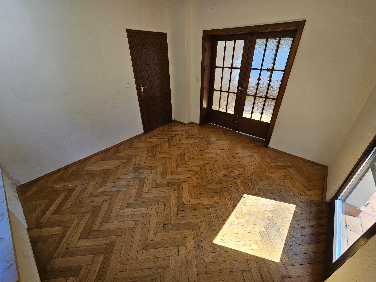 Im Inneren unterstreichen Sprossen-Doppelflügeltüren mit Glaseinsätzen, ein hochwertiger Schiffsbodenparkett im Wohnbereich sowie die massive gewendelte Holztreppe den besonderen Charme.
